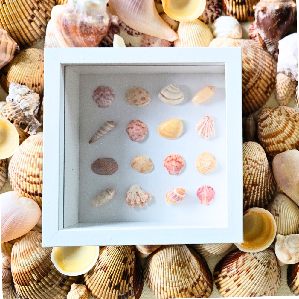 Seaside Treasures Framed Shell Art is a 6' x 6' shadow box of beautifully unique shells arranged in an artistic grid by Francie. Each frame contains a variety of shells from Florida beaches, hand-harvested by Francie and her sister friends. No two frames are alike, and they look fabulous in groupings of two or more. The shells are carefully washed before mounting, and no living shells are harvested. The frame has an easel and a wall mount bracket for display on a shelf or on a wall, Seaside Treasures Framed Shell Art shadow boxes will delight any shell lover with their exquisite designs. Great for your desk, a collection on the wall, or even as tabletop decor for special events. Shell collections and colors vary. The image represents the approximate collection of shells, as each frame will be unique but similar.